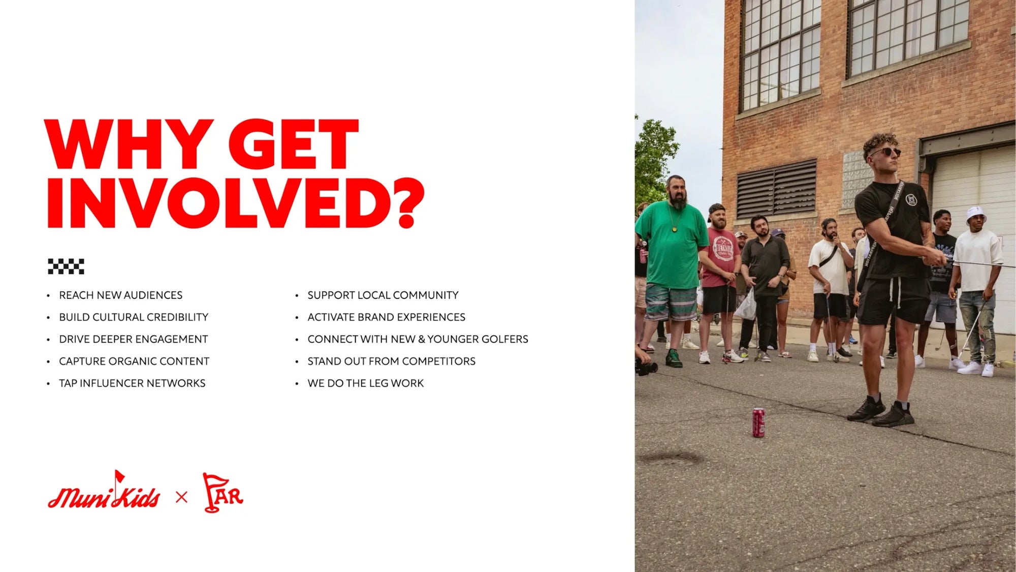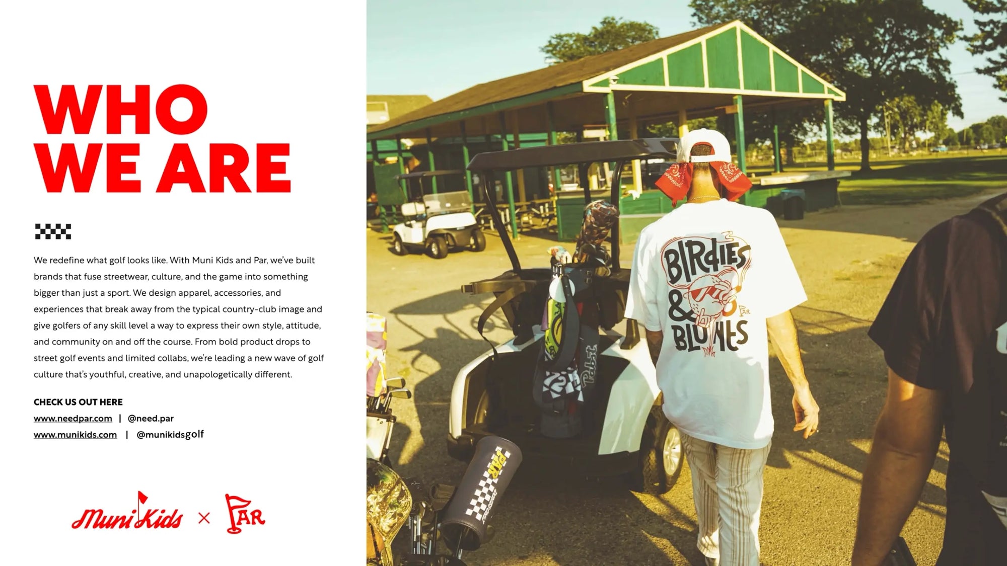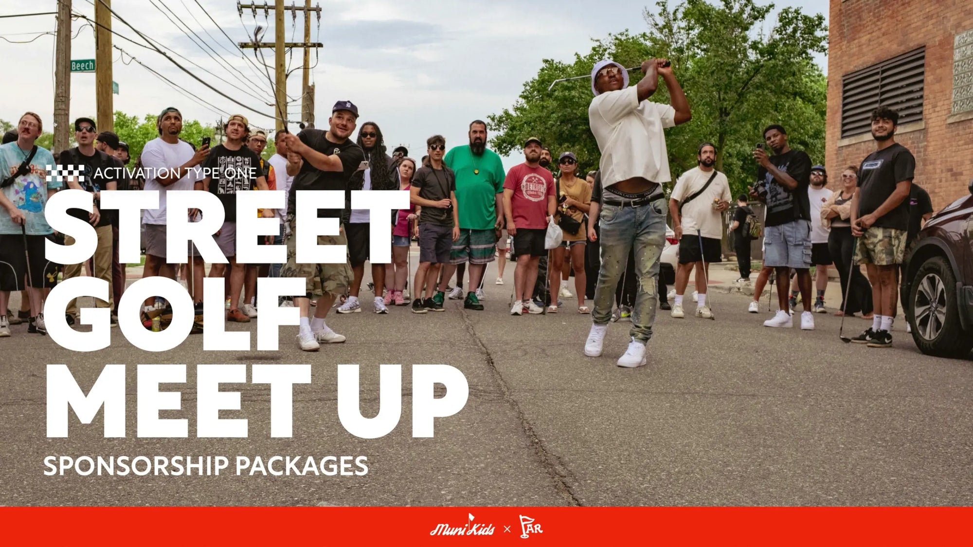 WHERE WE BELIEVE IN GROWING THE GAME OF GOLF AT THE GROUND LEVEL, THE STREETS. WITH 6 YEARS OF ORGANIZED STREET GOLF MEETUPS AROUND THE COUNTRY MUNI KIDS HAS INTRODUCED HUNDREDS OF NEW PEOPLE TO THE GAME THROUGH THEIR EVENTS AND MADE GOLF A MUCH MORE WELCOMING SPACE TO ENTER.
