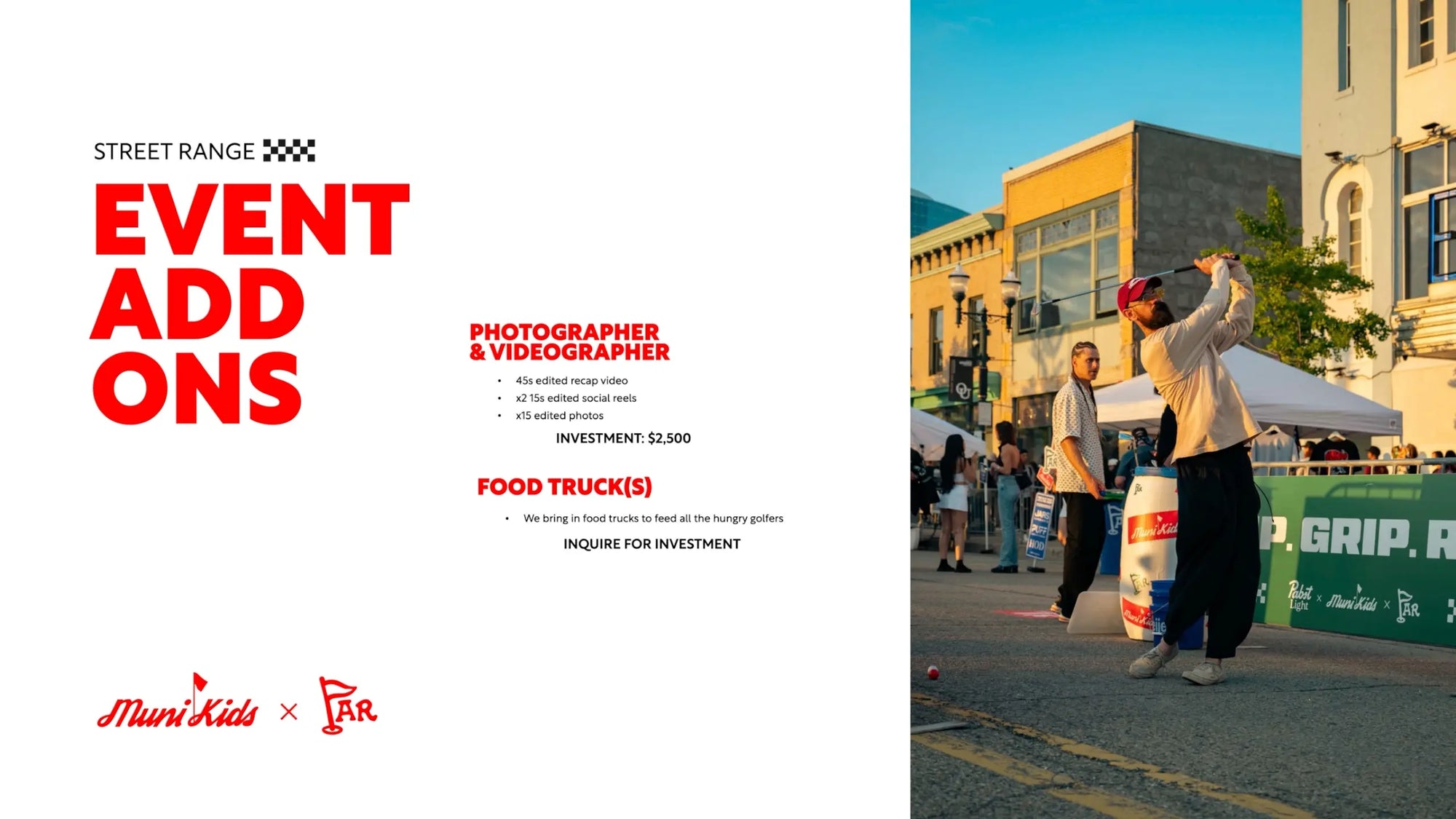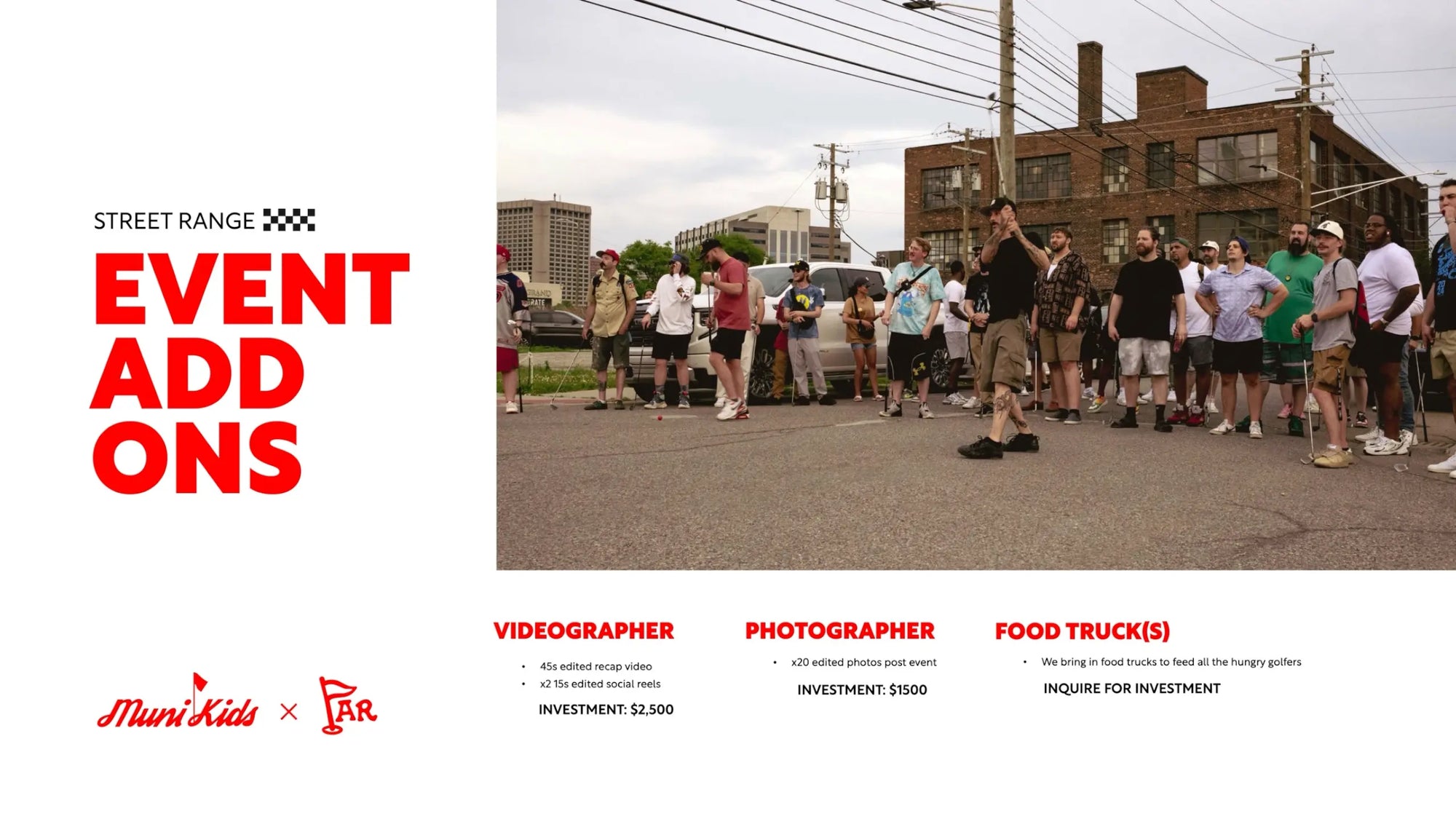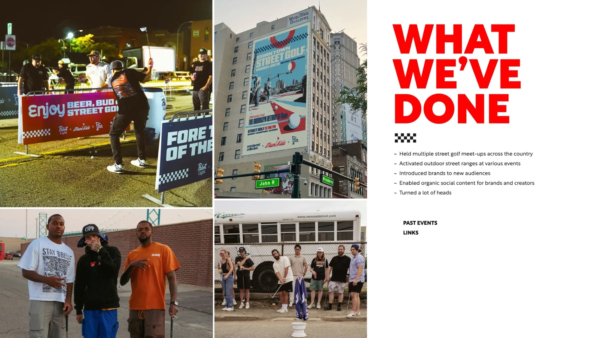 WHERE WE BELIEVE IN GROWING THE GAME OF GOLF AT THE GROUND LEVEL, THE STREETS. WITH 6 YEARS OF ORGANIZED STREET GOLF MEETUPS AROUND THE COUNTRY MUNI KIDS HAS INTRODUCED HUNDREDS OF NEW PEOPLE TO THE GAME THROUGH THEIR EVENTS AND MADE GOLF A MUCH MORE WELCOMING SPACE TO ENTER.